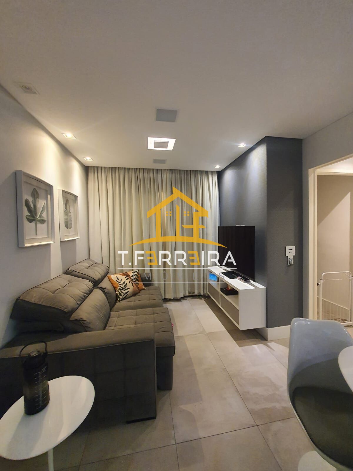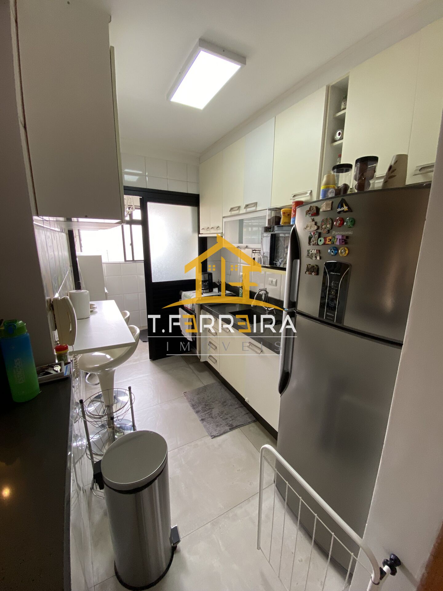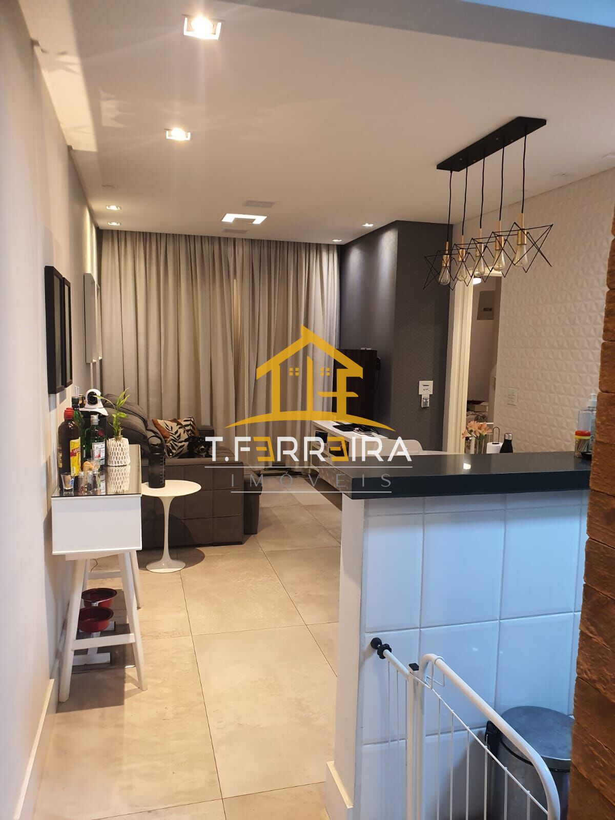 Sala com varanda envidraçada e dois ambientes, (estar e jantar), cozinha americana e área de serviço.